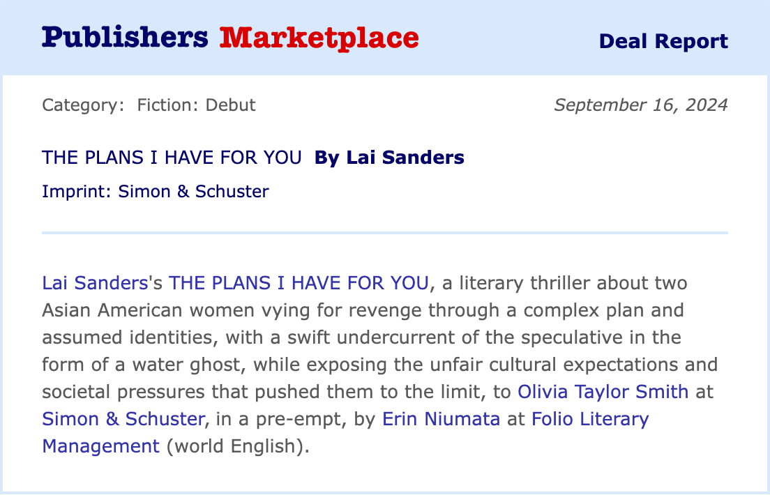In February, I sent a query to Erin at Folio after seeing an online comment that said she was partial to revenge stories. Her colleague, Jess, found it in the slush pile, and they asked to see the full manuscript. We started working together in March. Erin and Jess read draft after draft and gave thoughtful feedback that strengthened the story I was trying to tell while staying true to my vision. Their colleague from Folio, Sharon, also read and provided excellent notes on one of the drafts. Together, they helped me reshape The Plans I Have for You into what it is today: a story that is darker and angrier and even more unhinged than what I’d set out to write. It became a story that was good enough and weird enough to get Olivia’s attention and find a home with S&S.