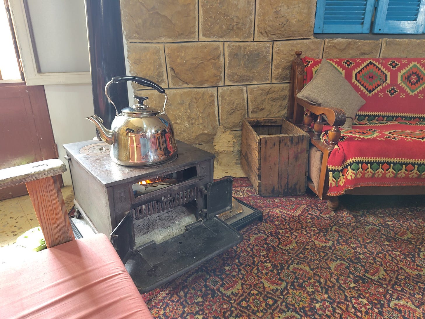 Two hours later we are at a local guesthouse. The owner, a friendly woman in a pink sweater, will show us how to cook a traditional Lebanese meal with the herbs we’ve just gathered. The table is set, flour ready. In the corner a large kettle of black tea boils on the stove. I curl up on the couch by the stove and close my eyes, feel myself sink deeper and deeper. Just a little rest. I’ll get up soon. I want to watch her cook.